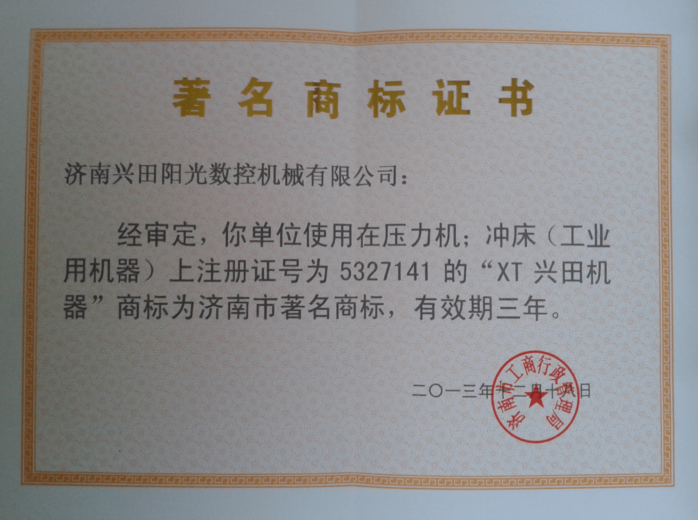 濟南市著名商標證書